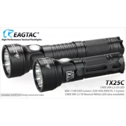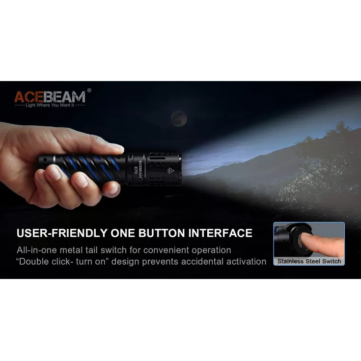 The E70 offers 6 brightness levels and a strobe mode, all of which are operated by the stainless steel switch on the tail end of the torch. The switch must be double clicked to turn the light on to prevent accidental activation.