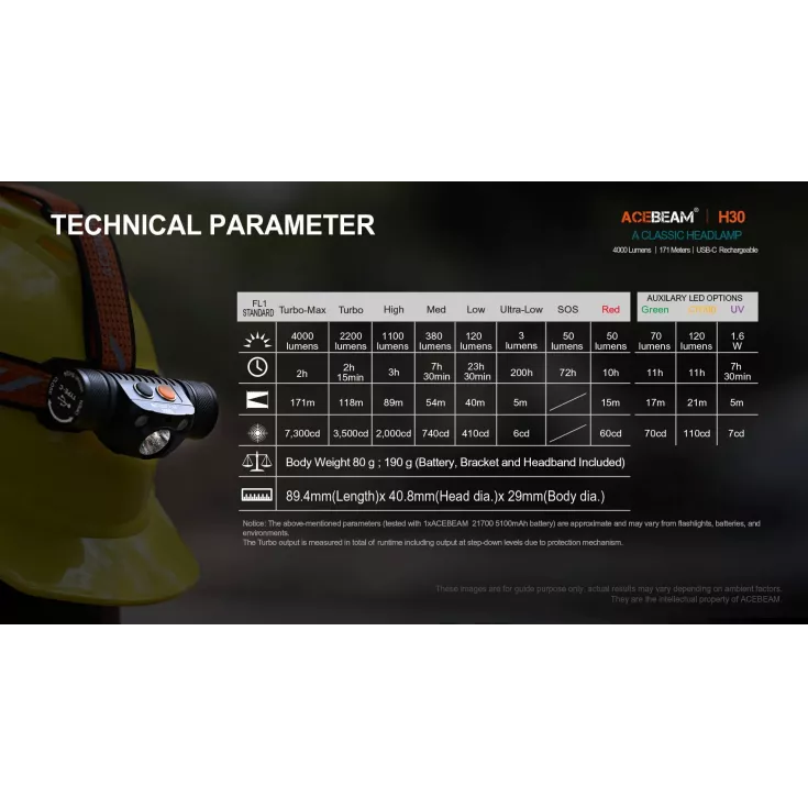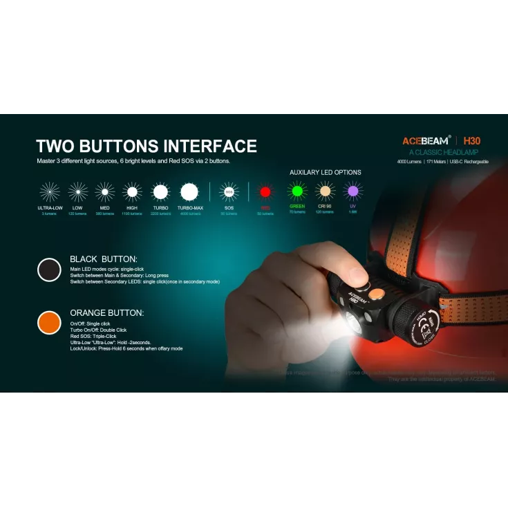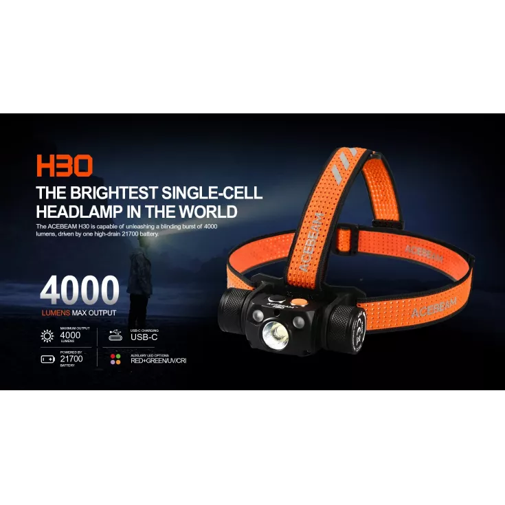 The head torch features 6 brightness levels ranging from 3 to 4000 lumens, plus an SOS mode for emergency use. Additionally, the H30 has auxiliary red and green lights which can be used to protect night vision and reduce eye strain. All outputs are operated by the dual switches on top of the lamp, for fast and easy access to the desired mode. Lockout mode is available to prevent accidental activation.