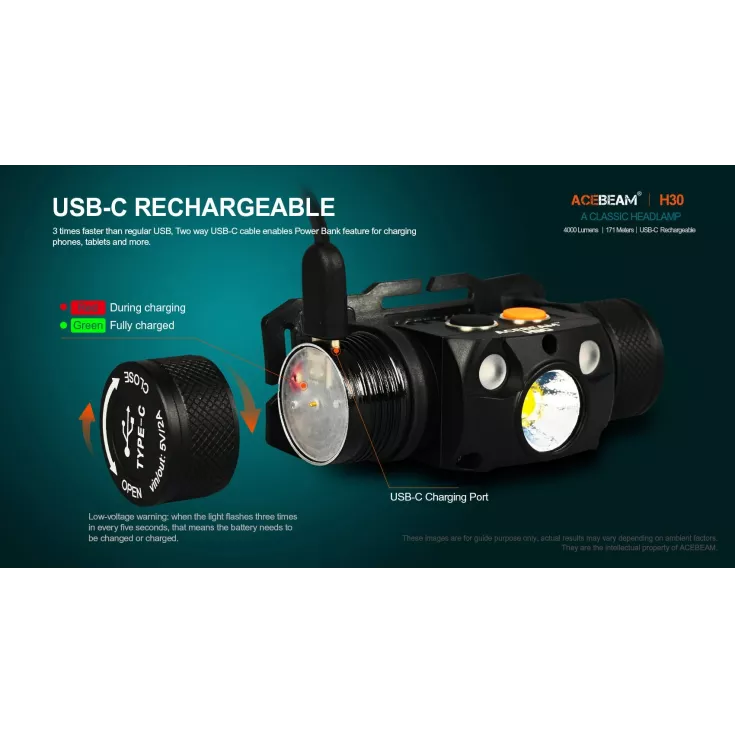 The Acebeam H30 headlamp has an impressive maximum output of 4000 lumens from the Cree XHP70.2 6500K cool white LED and is powered by an included 21700 li-ion battery. The light is rechargeable via a USB-C port beneath the screw cap on the side of the light. The charging indicator will change from red to green once charging is complete.