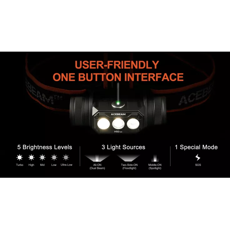 The Acebeam H50 2.0 headlamp has a maximum output of 2000 lumens from the 3 x Luminus SST-20 LEDs and is powered by 1 x 18650 li-ion battery (included). The light is rechargeable by a concealed USB-C charging port which can be found at the end of the head torch.