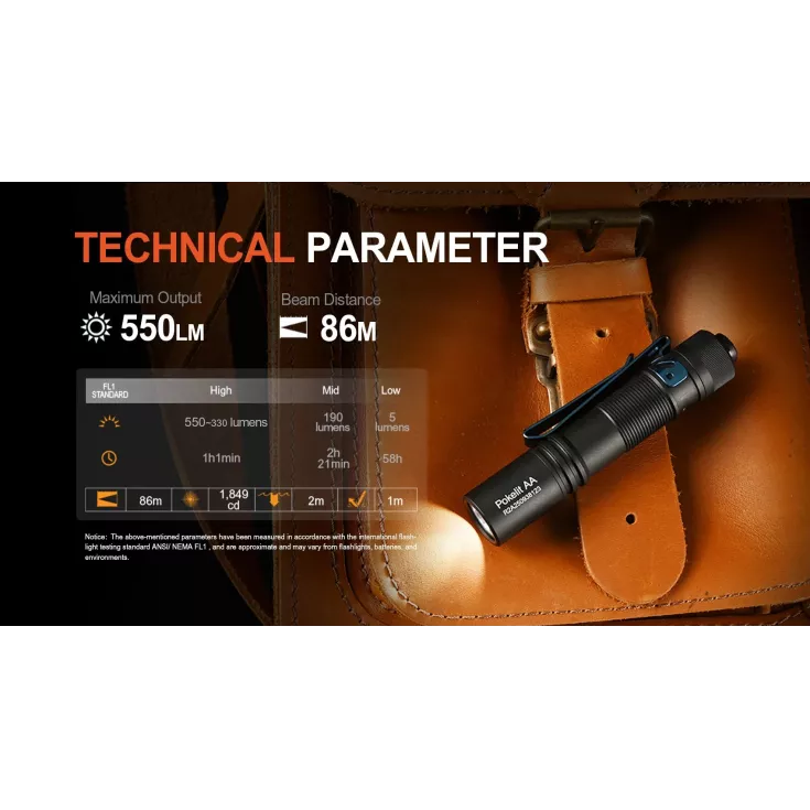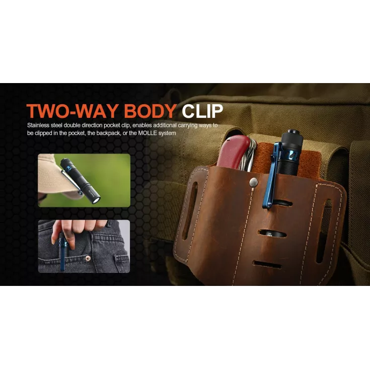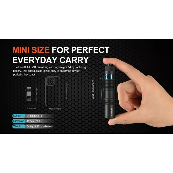 The Pokelit AA weighs just 56.6 grams including battery and measures 95mm long, making it easy to carry. A two way removable body clip allows the Pokelit AA to be attached to clothing / backpacks and even the brim of a cap for hands free use.