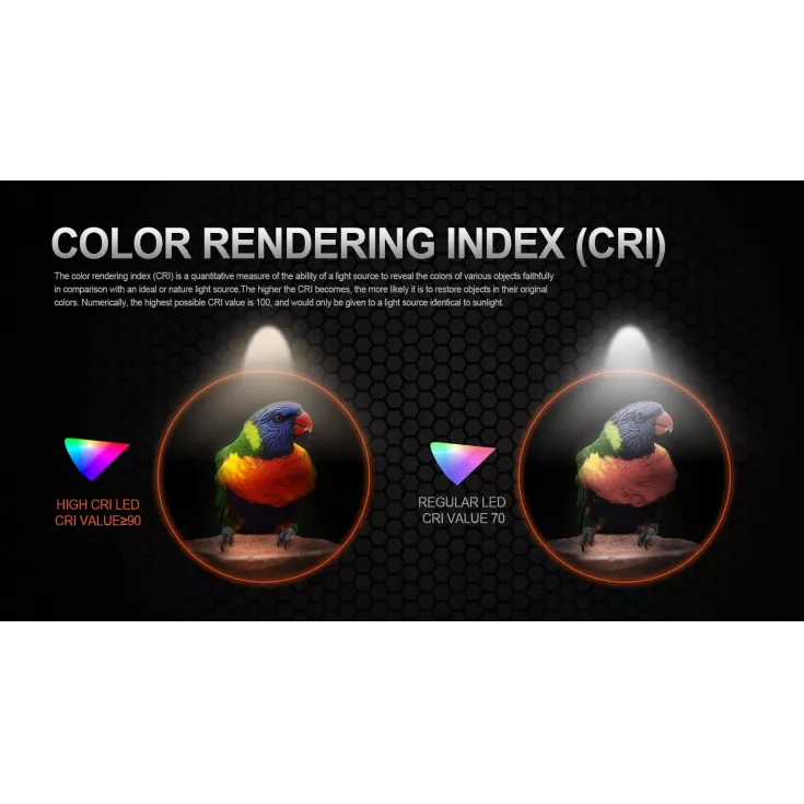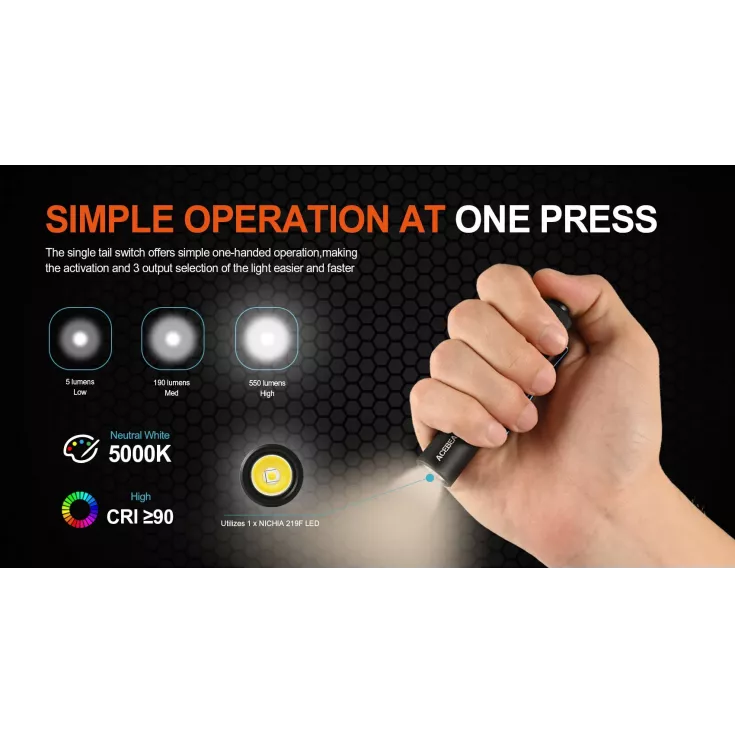 When powered by the included 14500 battery the maximum brightness is an impressive 550 lumens! Featuring a Nichia 219F 5000K CRI90 LED for accurate colour rendition.