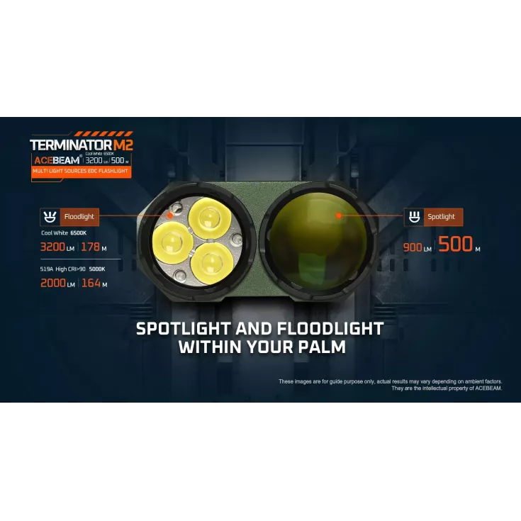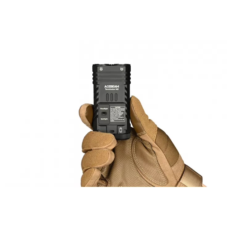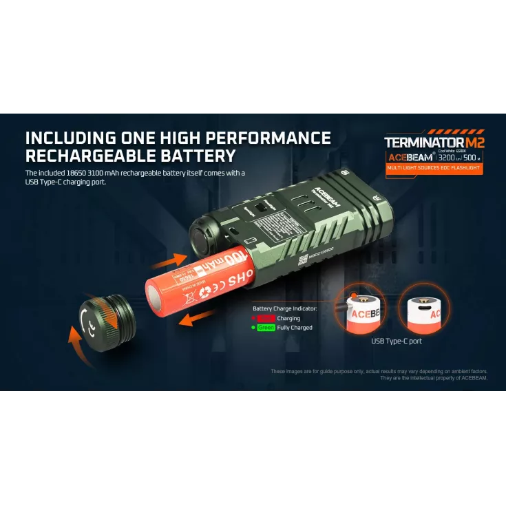 The Acebeam Terminator M2 torch has a maximum output of 3200 lumens from the cool white 6500K LED and 2000 lumens from the neutral white 5000K CRI90 LED. The light is powered by 1 x 18650 li-ion battery and the included cell has a built-in USB Type-C port for direct recharging into the battery, removing the need for a separate external charger.