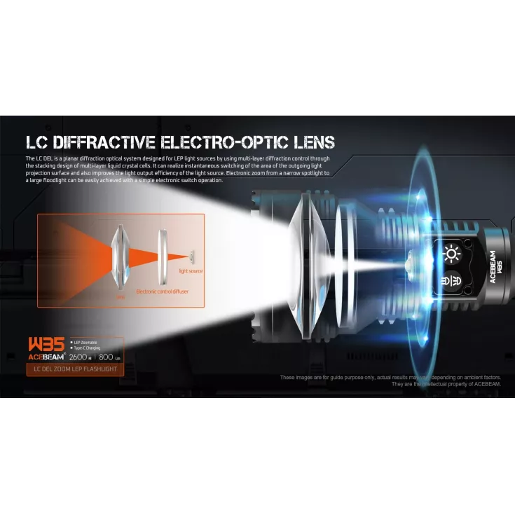 The Acebeam W35 is the first LC Del Zoom (Liquid Crystal Diffractive Electro-Optic Lens) LEP flashlight available, powered by 1x Acebeam 21700 Battery to produce a maximum brightness of 800 lumens at up to 2600 metres.