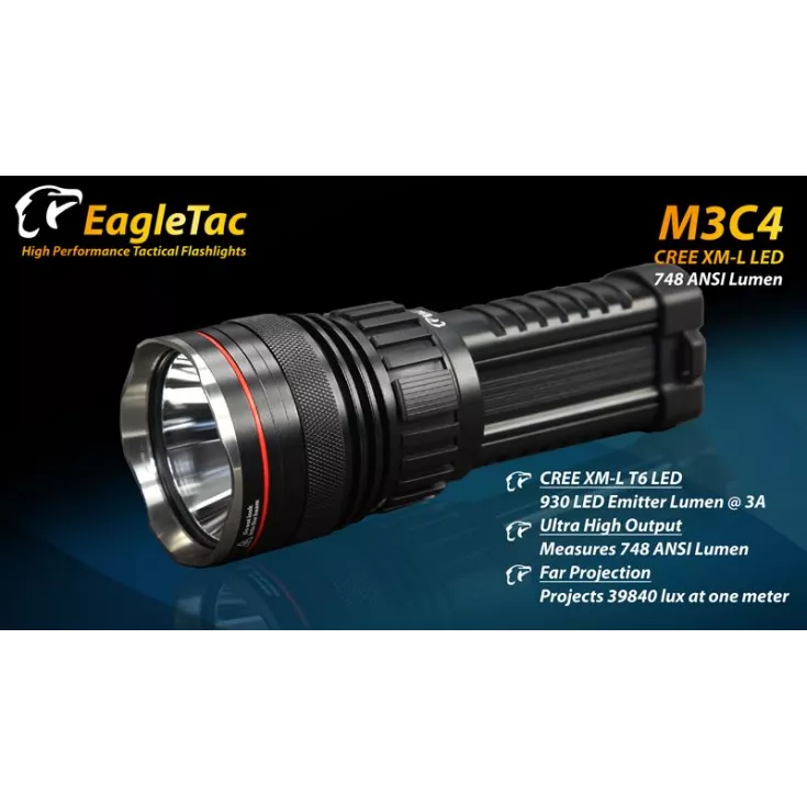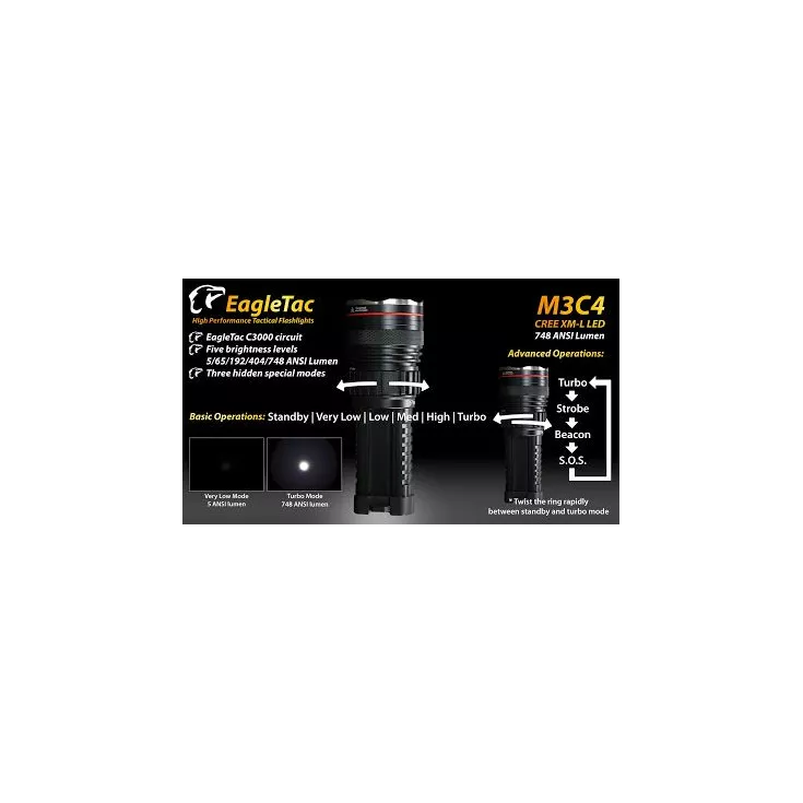 The Eagletac M3C4 has a maximum brightness of 625 lumens from the Cool White Cree MC-E LED and is powered by 4 x CR123 or 2 x button top 18650 batteries (not included).