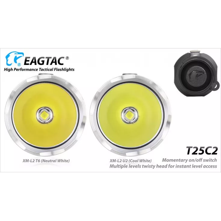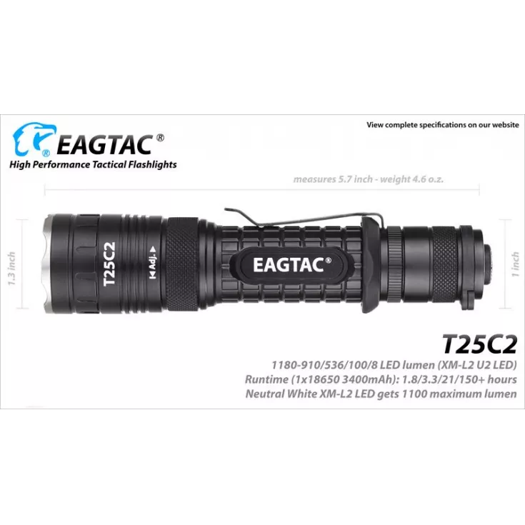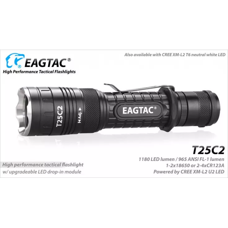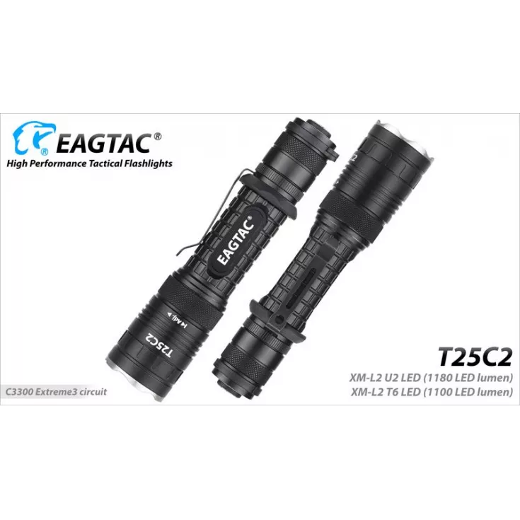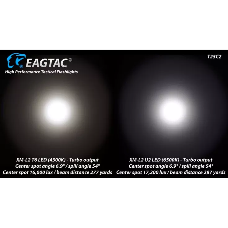 The Eagletac T25C2 has a maximum output of 965 LED ANSI Lumens from the Cree XM-L2 U2 LED.