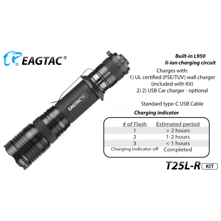 The rechargeable, handheld flashlight has a built-in L950 Li-ion charging circuit, which allows for the battery to be charged inside the torch, for your ease and convenience. The torch features an innovative Type-C USB charging cable to charge the torch. The T25L-R has a charging indicator to show how long until the battery is fully charged. One flash indicates the battery will finish charging in over two hours, two flashes means one to two hours and three flashes for less than an hour. When the battery is fully charged, the indicator will go off.