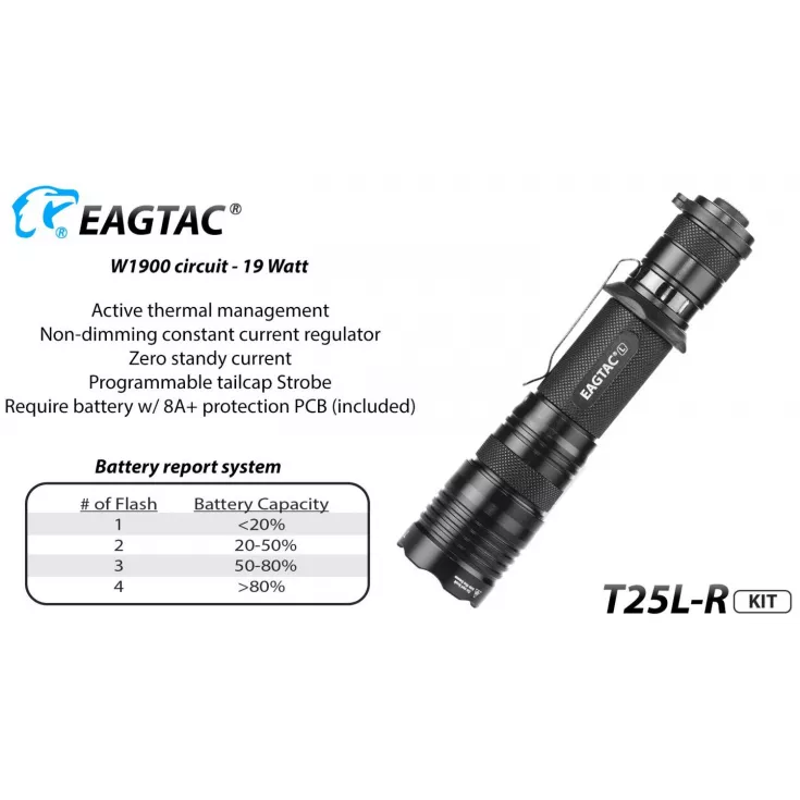 The Eagletac T25L-R torch has a maximum output of 1603 lumens from the Cree XHP35 HD E4 LED and can be powered using 1 x 18650 (included) Li-ion battery or 2 x single use CR123 cells.