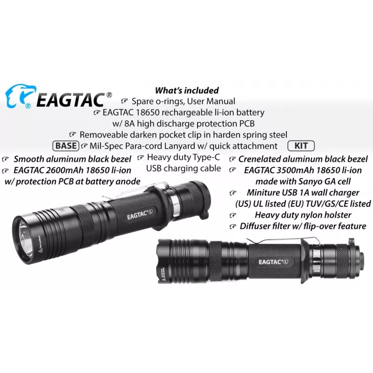 The Eagletac T25L-R is available as either a Base or Kit model, both of which include spare o-rings, an Eagletac 18650 battery, a removeable pocket clip, lanyard and type-c USB charging cable. The Base model comes with a smooth aluminium black bezel and a 2600 mAh 18650 battery. The Kit model has a crenulated aluminium black bezel and comes with a 3500 mAh 18650 battery, a miniature USB 1A wall charger, a nylon holster and a diffuser filter.