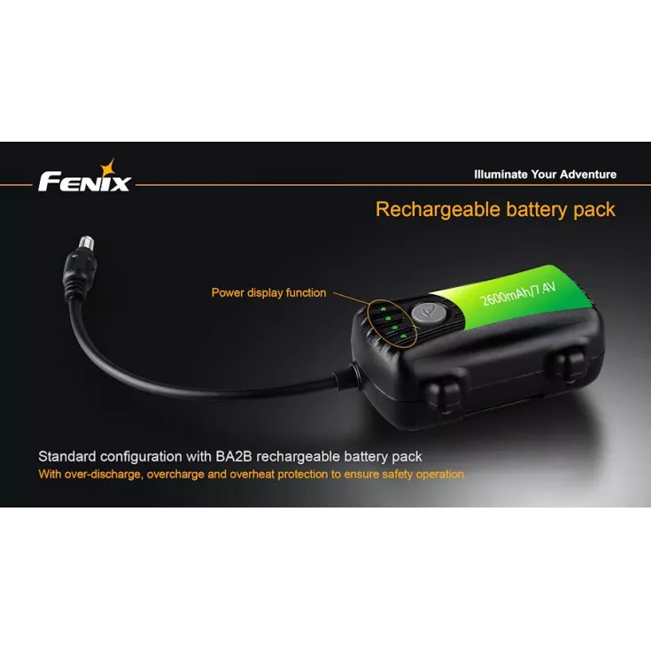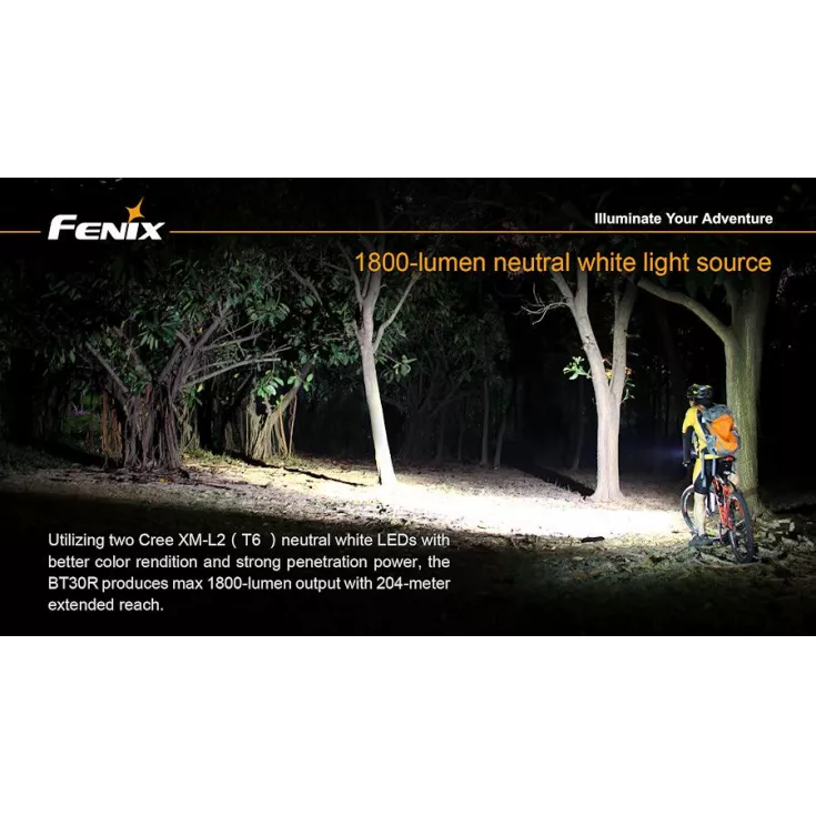 The compact Fenix BT30R Bike Light has a maximum output of 1800 lumens from the 2 x Cree Neutral White XM-L2 T6 LEDs and is powered by the separate plug-in Fenix BA2B 2600 mAh 7.4V rechargeable battery pack (included).
