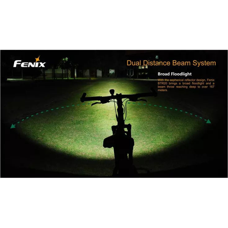 The Fenix BTR20 features a Cree XM-L T6 Neutral White LED with a maximum output of 800 lumens. The neutral white tint provides excellent colour rendition and improved penetration of rain and fog. The wide beam aspherical reflector delivers a innovative dual distance illumination, covering a wide area both close in and at long range.