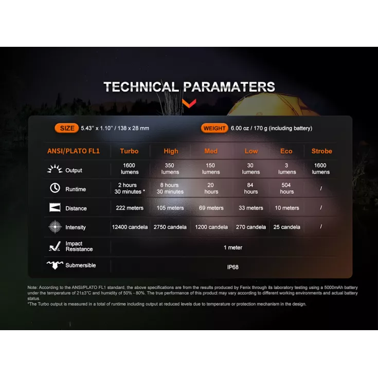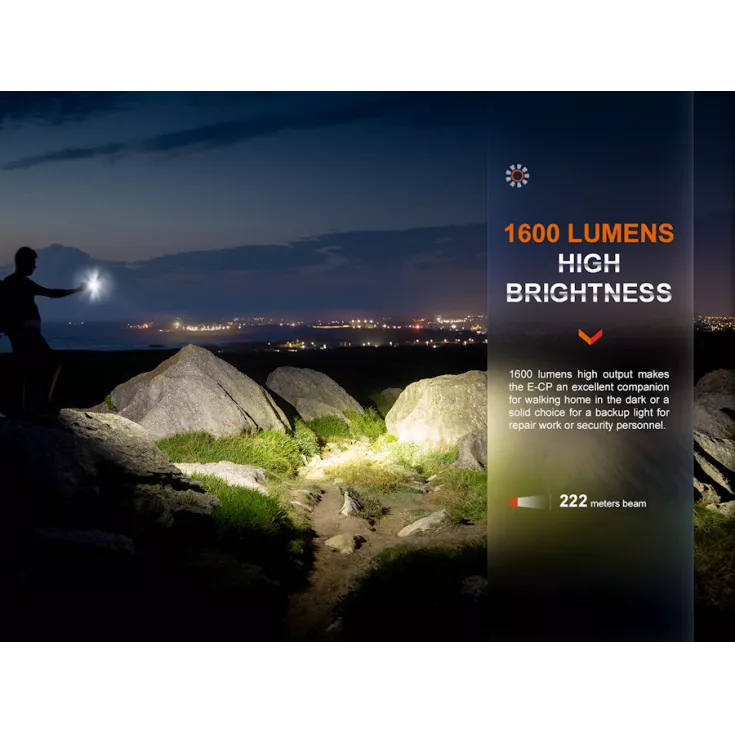 Turbo: 1600 lumens, 2hrs 30mins runtime, 222 meter beam distance