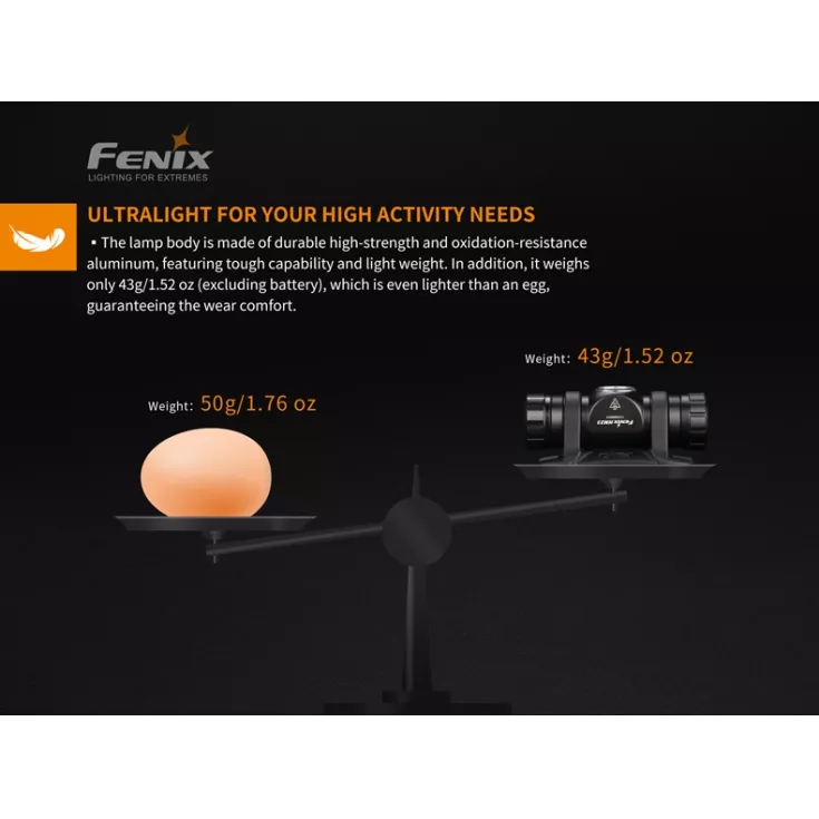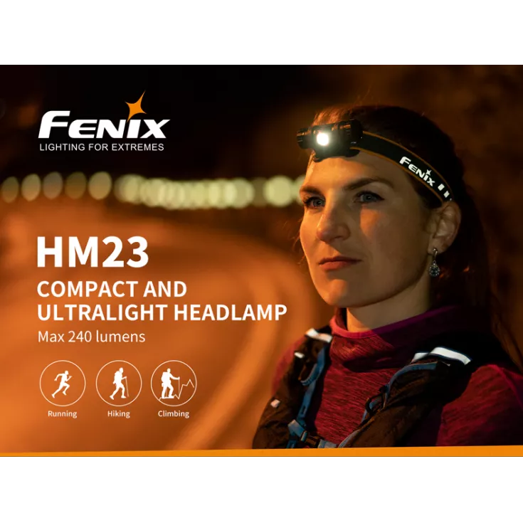 The Fenix HM23 head torch offers a maximum output of 240 lumens and is powered by 1 x AA battery (alkaline or NiMH). Lightweight and compact, the headlamp is the ideal companion for trail running, hiking and camping expeditions.