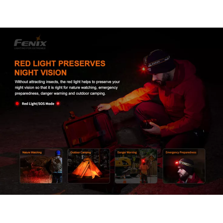 Red Light: Preserves the users adapted night vision and helps prevent attracting insects.
