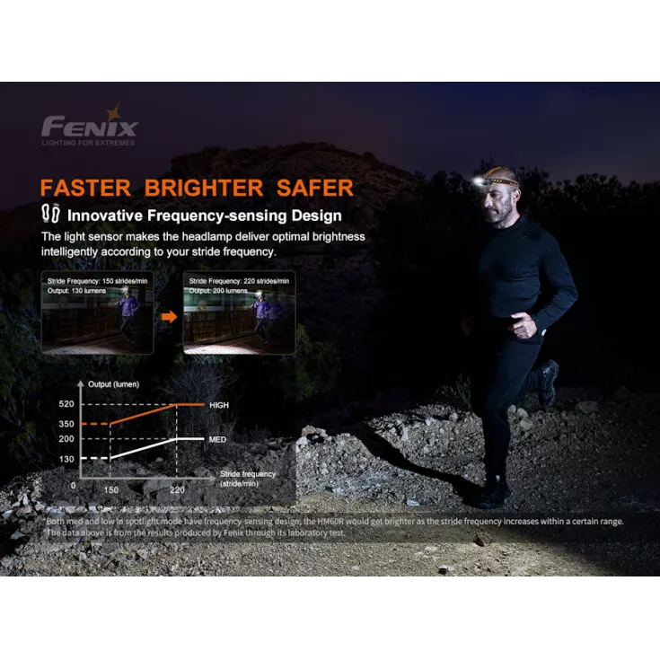 The Fenix HM60R is a unique headlamp with the option of ‘intelligent frequency adjustment’ for runners that will adjust the brightness in accordance with the users strides per minute. This function works in spotlight Medium and High brightness settings, so the HM60R can also be used by non-runners, who can take advantage of the triple light sources; Spotlight, Floodlight and Red light outputs.