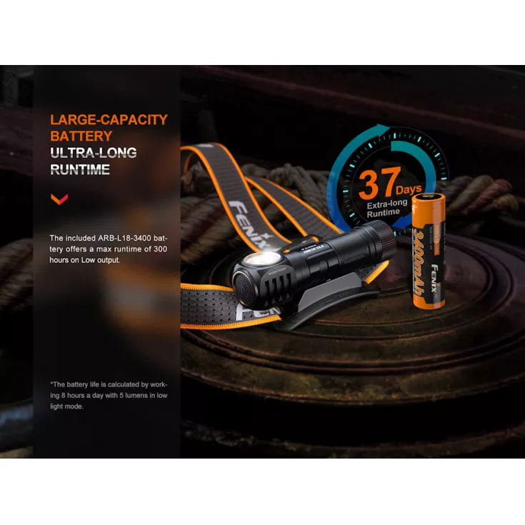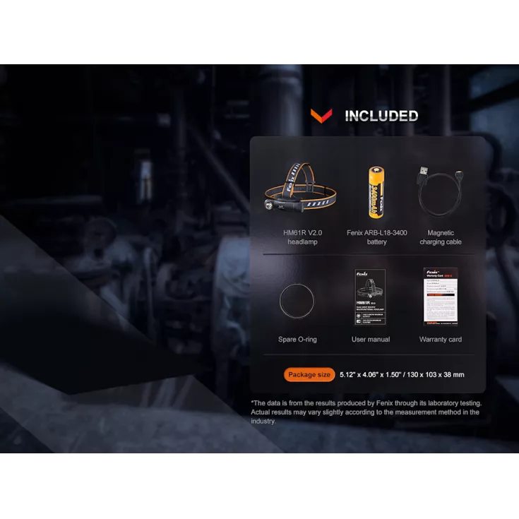 Fenix HM61R Includes: ARB-L18-3400 18650 li-ion battery, magnetic USB charging cable, headband, pocket clip and spare o-ring.