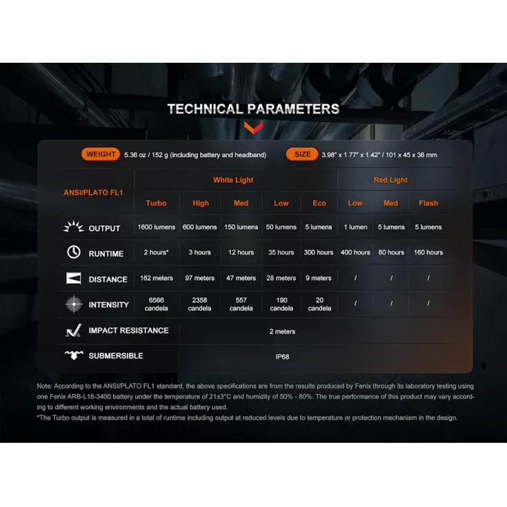 Turbo*: 1600 lumens – 2 hours runtime – 162 meters