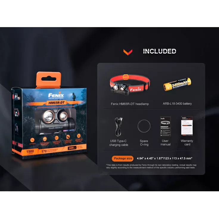 Included: 1 x HM65R-DT, 1 x 18650 battery, 1 x USB-C charging cable, 1 x spare o-ring