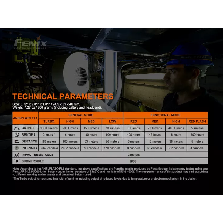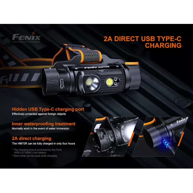 Fenix HM70R Includes: ARB-L21-5000 5000mAh 21700 Li-ion battery, USB Type-C Charging Cable and spare o-ring.