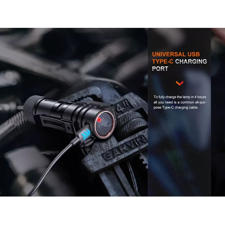 Powered by a 21700 Li-ion battery, the HM71R includes a Fenix ARB-L21-5000 V2.0 battery which charges via the USB-C port on the side of the lamp.