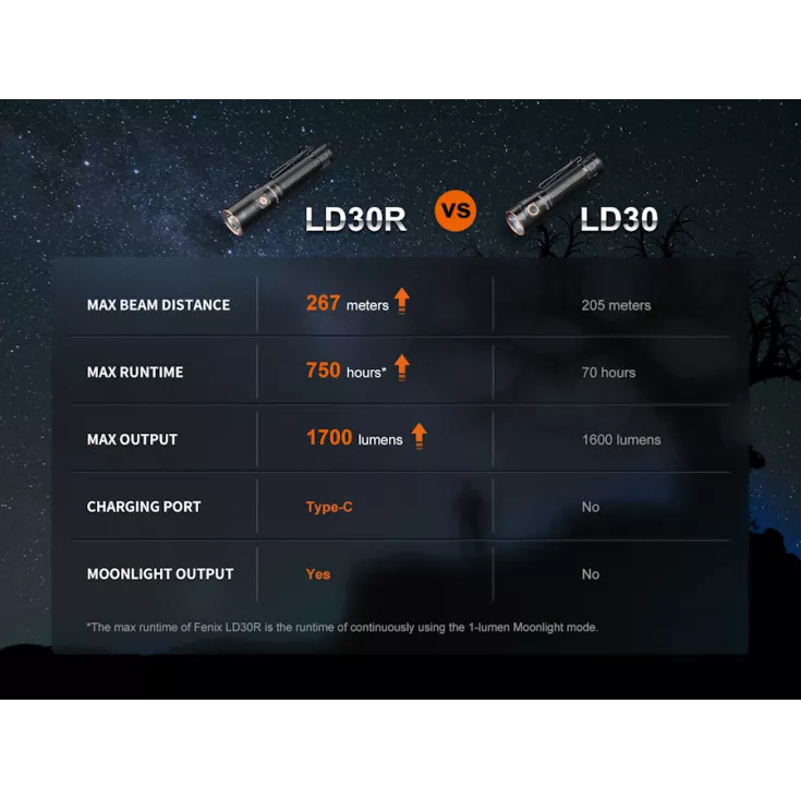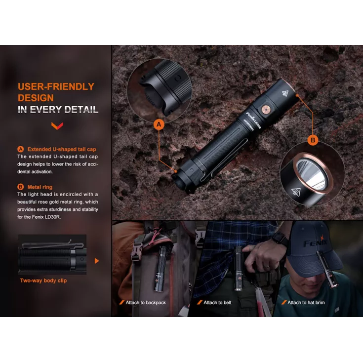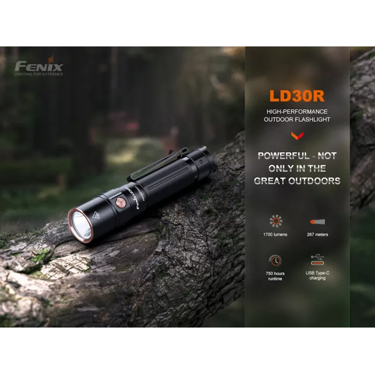 The Fenix LD30R is a compact and lightweight rechargeable torch with a maximum output of 1700 lumens and a maximum beam distance of 267 meters. It is powered by 1 x 18650 li-on battery (included) and can be recharged from flat in as little as 3 hours using the USB-C charging port.
