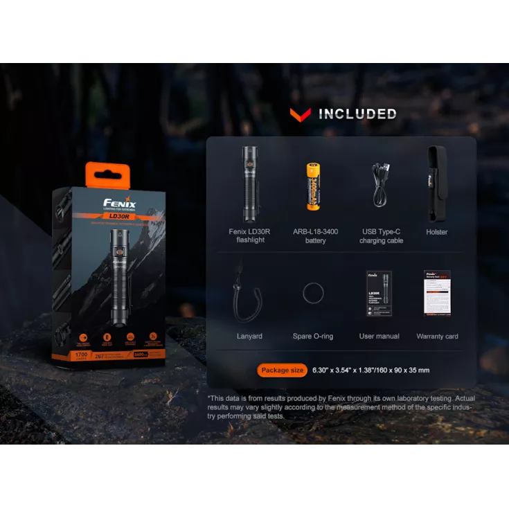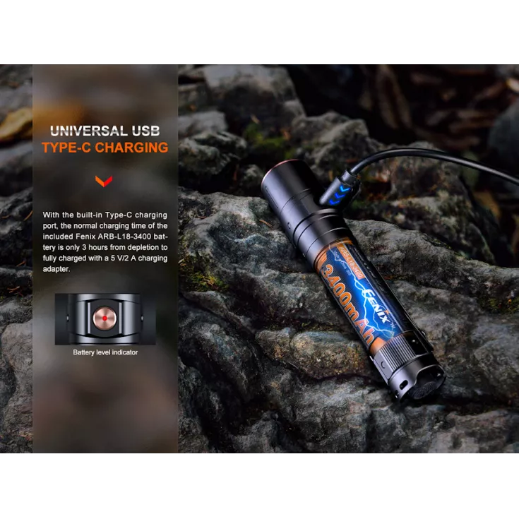 Included: Fenix 18650 li-ion battery, USB-C charging cable, holster, lanyard, spare o-ring.