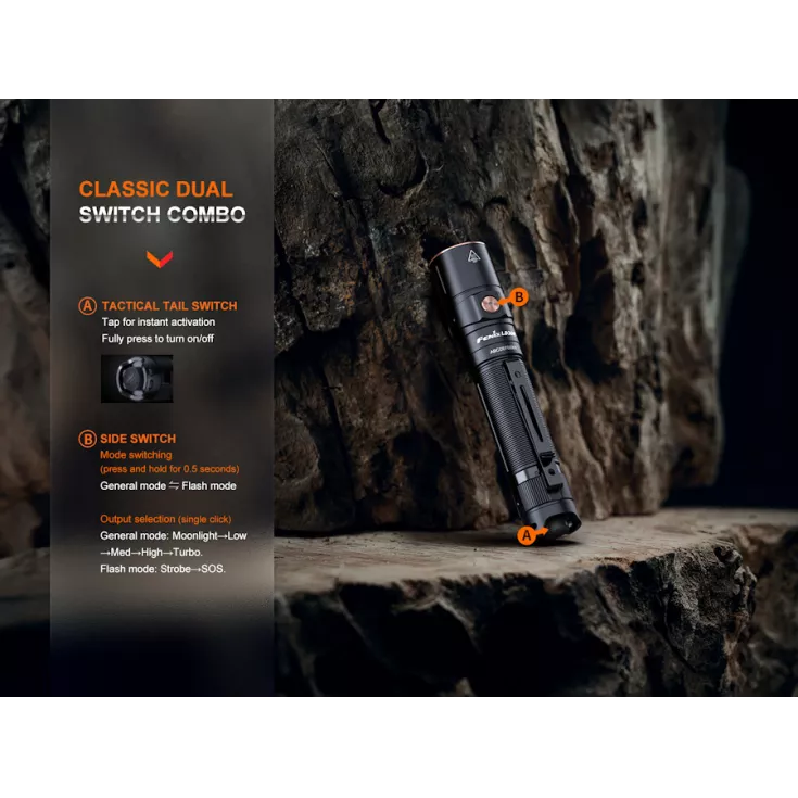 The flashlight features a dual switch operation. A tail switch controls momentary on/off function and the mode switch offers 5 brightness levels. Simply click the side button to cycle through the modes from moonlight to turbo. The mode button also features built in red and green LEDs which indicate charging/charged status and battery level.