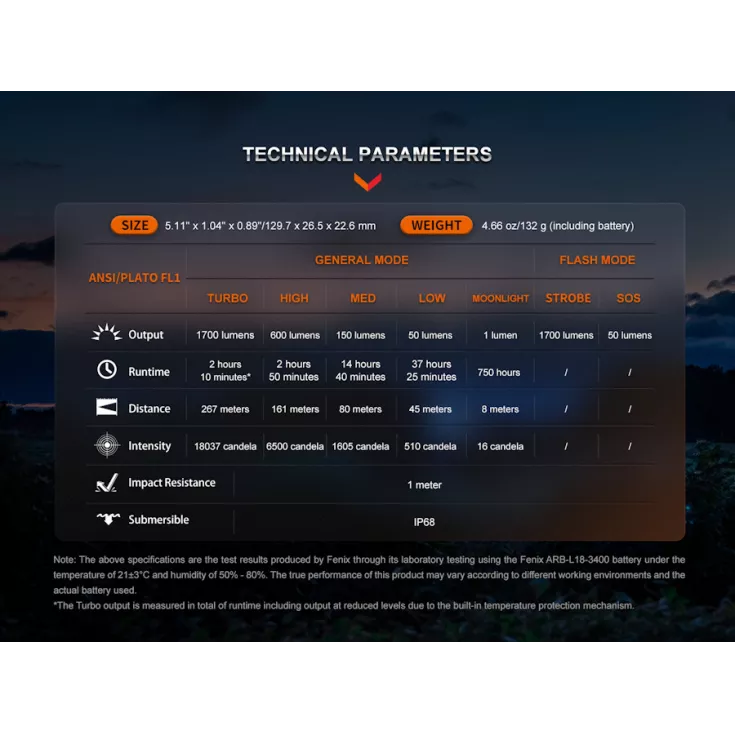 Turbo: 1700 lumens (2 hrs 20 min total), 267m beam