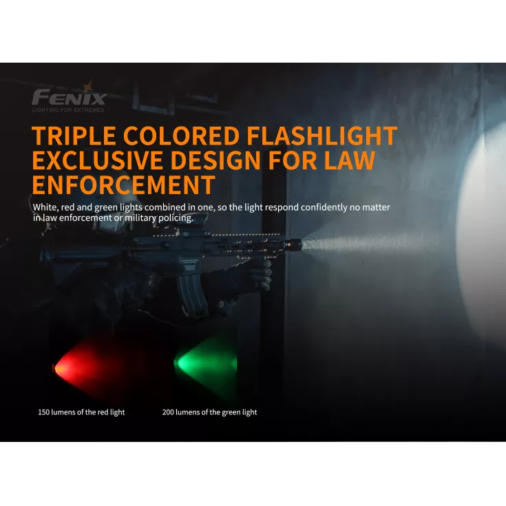 The Fenix TK26R features White, Red and Green LED outputs making it suitable for a variety of applications without the need for cumbersome filters. The main white LED is Luminus SST40, with Cree XP_E2 colour LEDs set either side in the reflector.