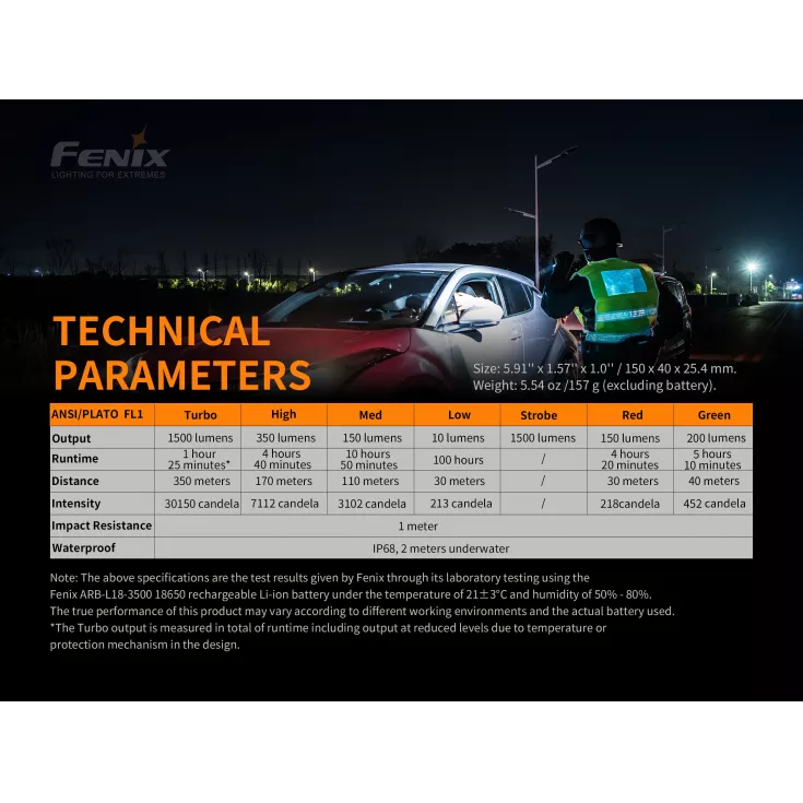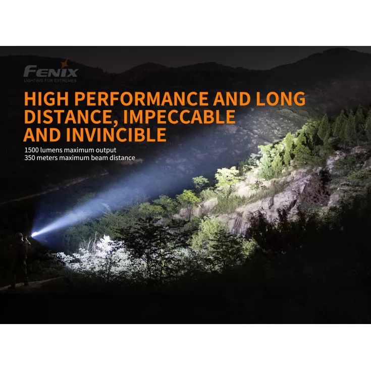 Turbo: 1500 Lumens – 1 hour 25 minutes* – 350 meters