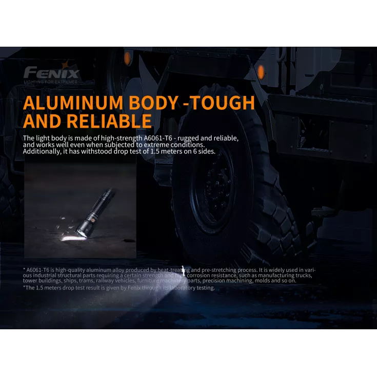 Made from the highest quality A6061-T6 aluminium that can withstand drops from up to 1.5 meters. Waterproof to IP68 (2 meter submersible) and able to withstand extreme working temperatures from -35 to +45 degrees centigrade.