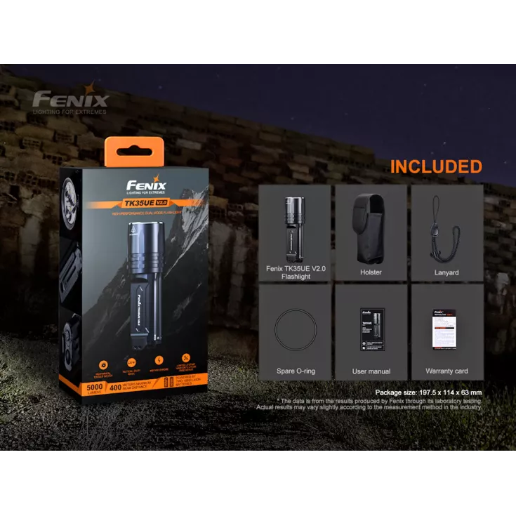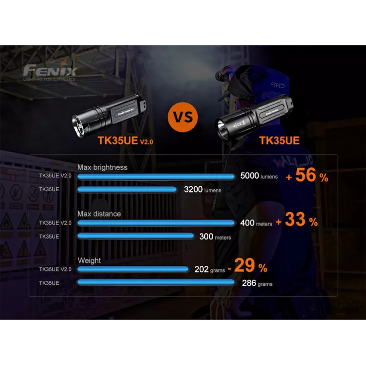 The Fenix TK35 Ultimate V2.0 is an upgrade of the very popular TK35 UE. Although compact and lighter than before, it has an improved output of 5000 lumens created by the Cree 3 x Luminus SST40 LED and a greater, more impressive beam distance of 400 meters. The torch is powered by 2 x 18650 li-ion batteries (not included).