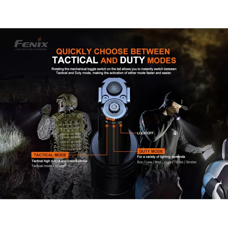 The flashlight has two modes that are easily selected by the mechanical toggle switch. These modes provide up to 5 brightness levels along with a strobe mode, giving you a wide choice of output and run time. A lockout function is also available.