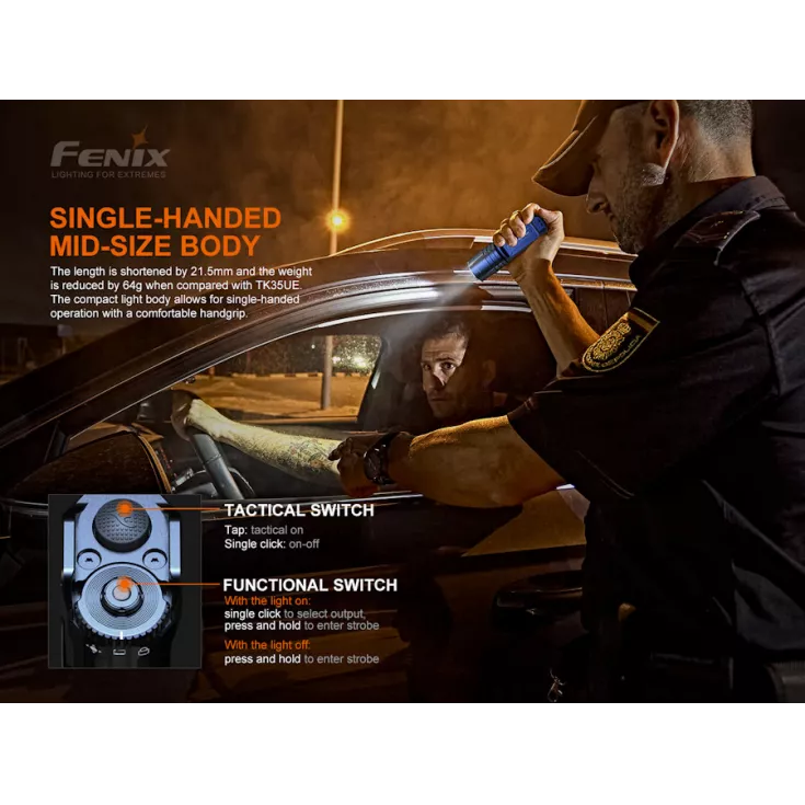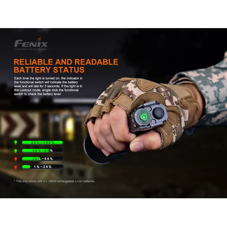 Each time the Fenix TK35 UE V2 is turned on, a battery level indicator will automatically display the battery status for three seconds. Constant green = fully charged, flashing green = good charge, constant red = low, flashing red = critical and needs charging.