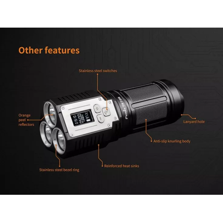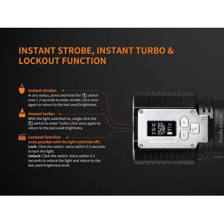 Operated via three stainless steel switches, which are positioned just below the display These give instant access to high power (5000 lumens), low power (200) lumens, instant strobe or the last used brightness level. Stepped light regulation means the TK72R can be adjusted from 100 lumens to 9000 lumens in 100 lumens increments by single clicking the +/- buttons or 1000 lumens increments by pressing and holding the +/1 buttons. Lockout function ensures the TK72R will not be turned on accidentally when not in use.