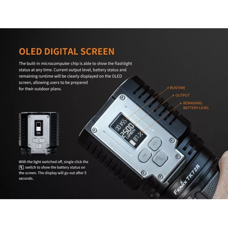 The TK72R features an OLED display that shows the status of runtime, current brightness level and remaining battery power.