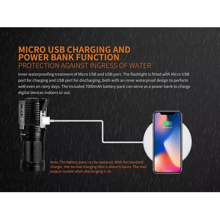 Featuring a 7000mAh battery pack inside the handle of the light, which is charged via micro USB (cable included). The TK72R can also act as a power bank to charge your phones or other mobile devices.