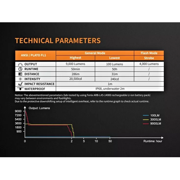 The brightness will lower down from 9000 lumens to prevent overheating. Please see graph in the images to check actual runtimes on the highest output.