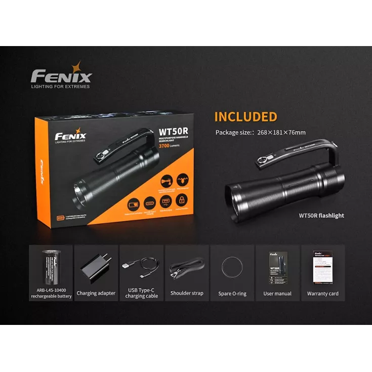 WT50R Included accessories: Fenix ARB-L45-10400 rechargeable battery, charging adapter, USB Type-C charging cable, shoulder strap, spare o-ring.