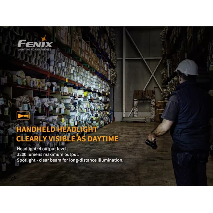 The Fenix WT50R work light offers a maximum output of 3200 lumens from the Cree XHP70 and 500 lumens from the innovative XP-G3 tail light LED. The torch is powered by an included Fenix ARB-L45-10400 7.2V 5200mAh battery pack which is rechargeable via a USB Type-C charging port at the base of the light.