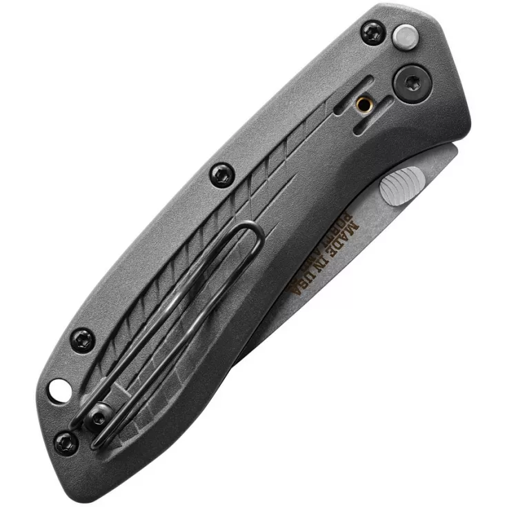 The grey handle is made from glass filled nylon and features a scratch resistant, removable pocket clip with the ability to carry tip up or down. The US Assist knife has a cross bolt safety lock which can be used to keep the blade open or closed.