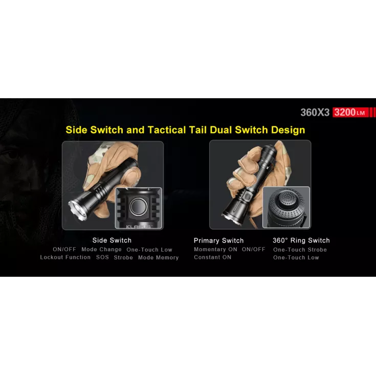 Featuring a 360º omni-directional dual switch, the torch can easily be operated, especially when using tactically, as the switch can comfortably be controlled using your thumb. The switch features anti-slip dots for good grip and is made up of a primary switch in the centre with a 360º ring switch around the central button. In addition, the 360X3 has a side switch for a less tactical approach to operation and providing an alternative hand position to suit general applications such as walking the dog.