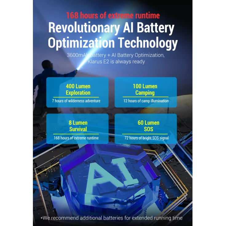 Klarus E2 Includes: 3600mAh 18650 Li-ion battery, wrist lanyard, soft carry pouch and spare o-ring.