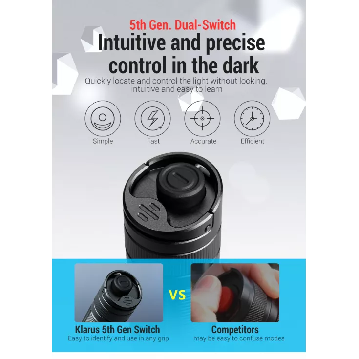 Featuring a Cree XHP35 HI LED with a maximum output of 1600 lumens the Klarus E2 is operated via the fifth generation Klarus dual-switch with two modes: