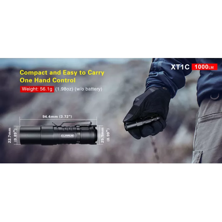 The Klarus XT1C compact torch has a maximum output of 1000 lumens from the Cree XP-L HD V6 LED and can be powered by 1 x RCR123 (16340) Li-ion or a CR123 single use battery. The light comes with a Klarus 16340 which has a micro USB port on the side of the battery, eliminating the requirement for a separate charger.