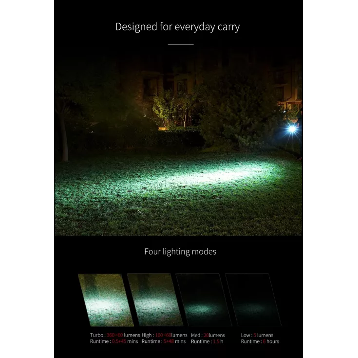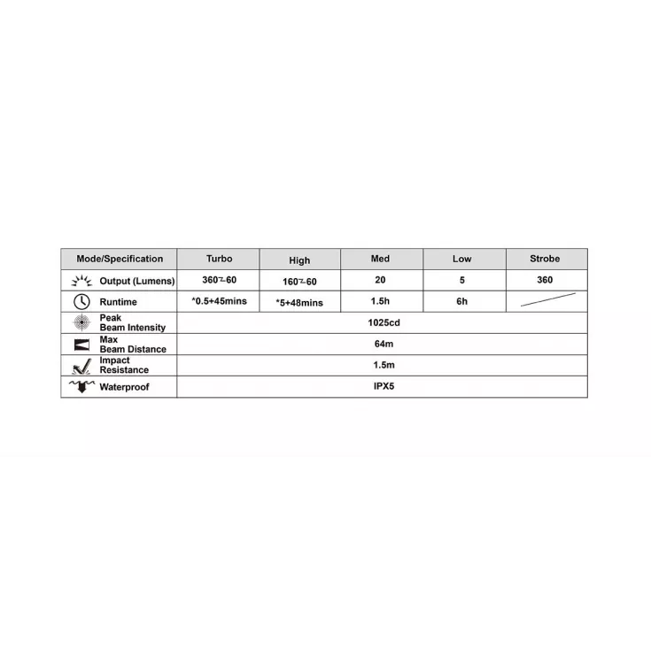 Turbo: 360~60 lumens – 0.5~45 mins runtime