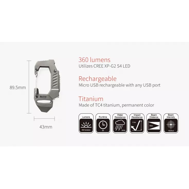 The MecArmy FL10 is an excellent multi-purpose carabiner clip that features a powerful torch amongst other useful tools. The light has a maximum output of 360 lumens from the Cree XP-G2 S4 LED and is powered by a built-in lithium polymer battery.