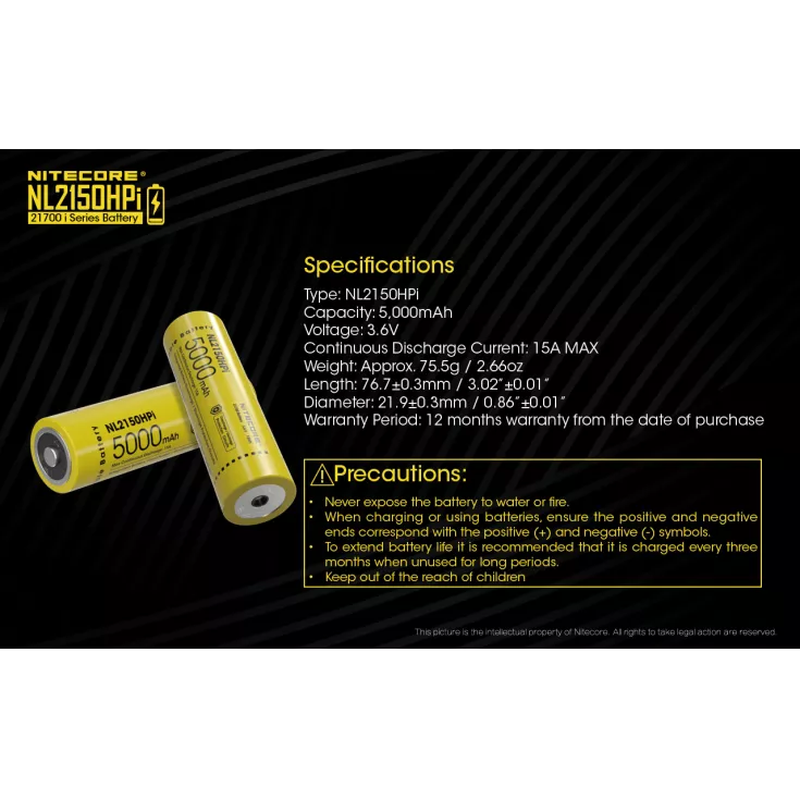 The Nitecore NL2150HPi is a rechargeable 21700 li-ion battery with a capacity of 5000mAh and a 15A continuous discharge current. Please note, this battery is specifically designed for the Nitecore i4000R, P10iX and P20iX flashlights.