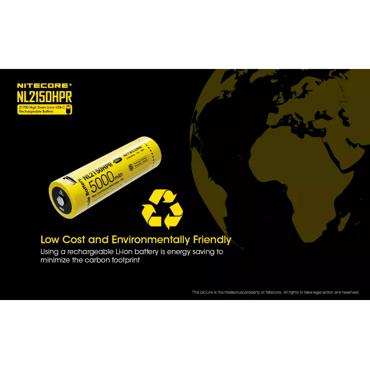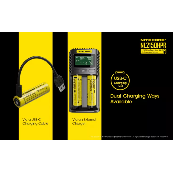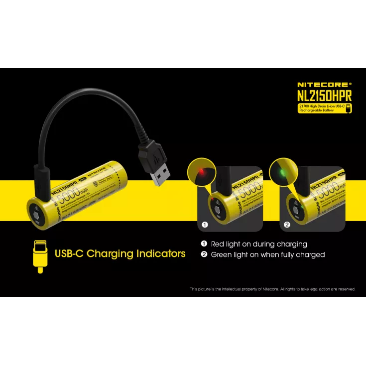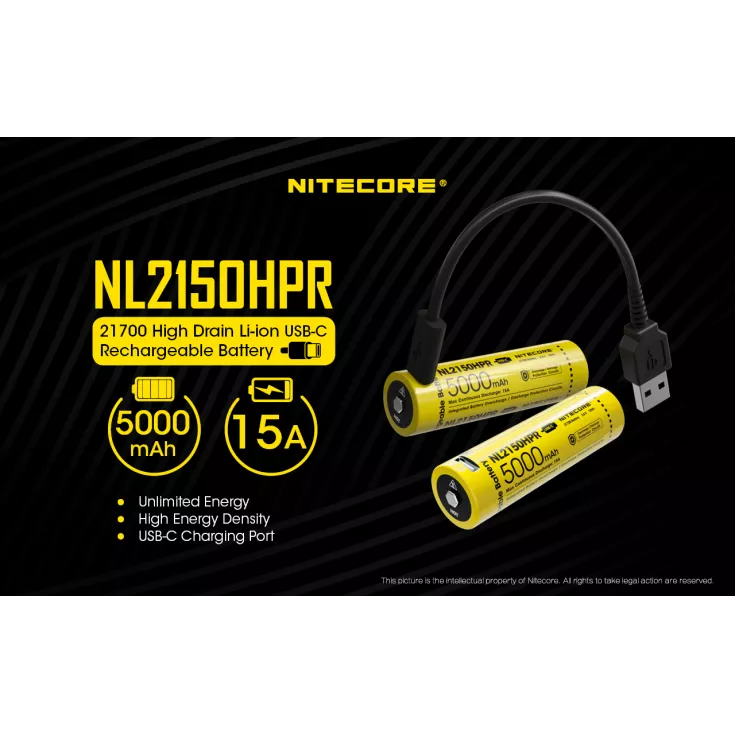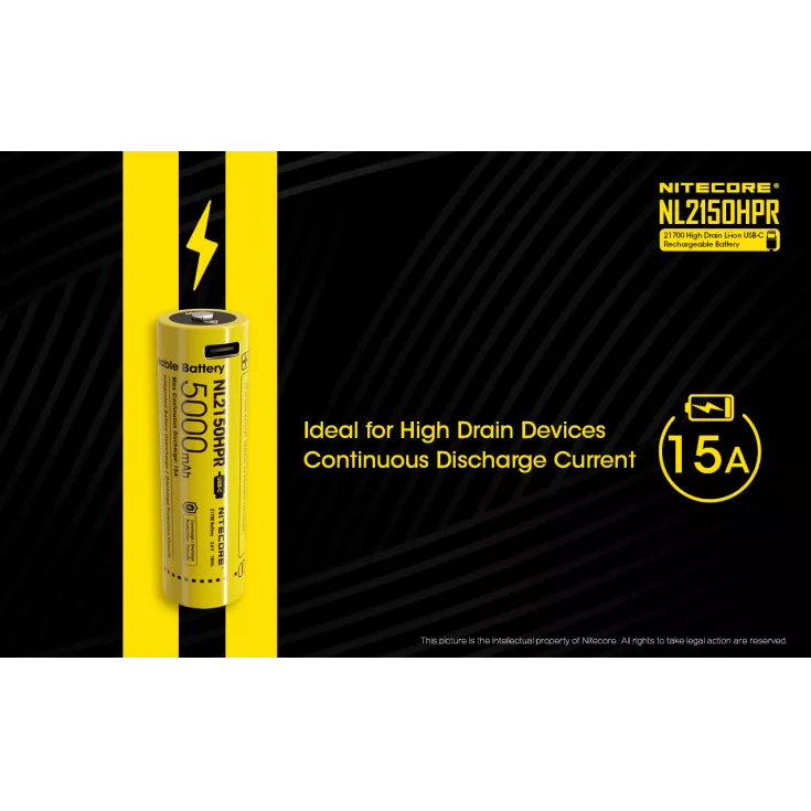 The Nitecore NL2150HPR 21700 battery is a high performance cell with a maximum capacity of 5000mAh, a 15A continuous discharge current and a USB-C charging port to remove the need for an external charger. Please note, a charging cable is not included.