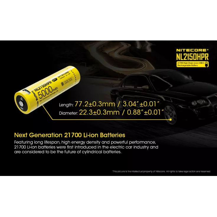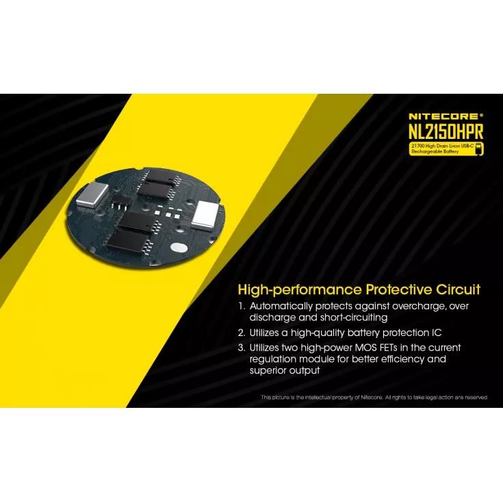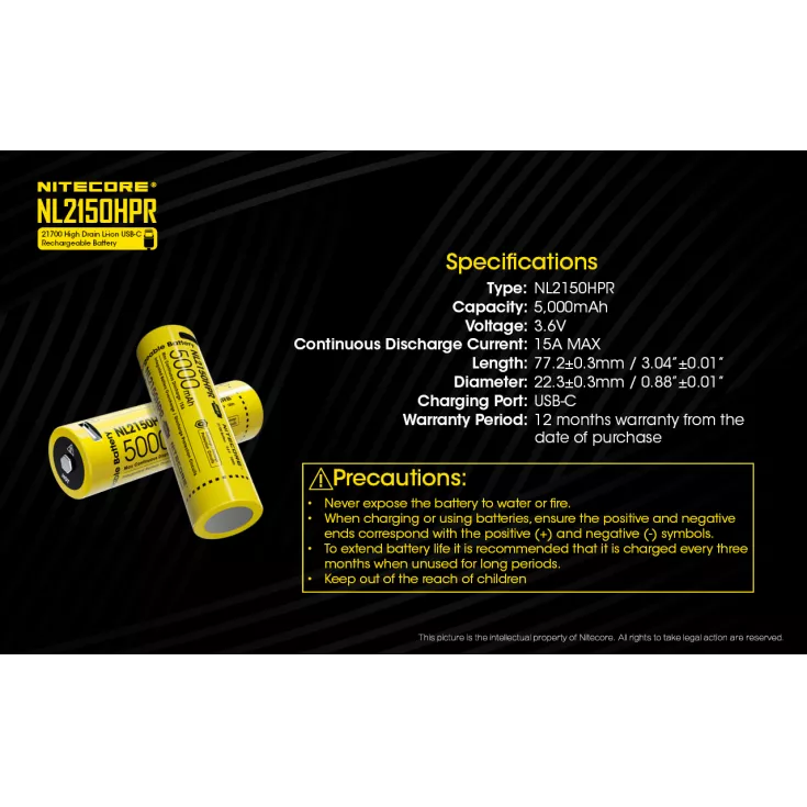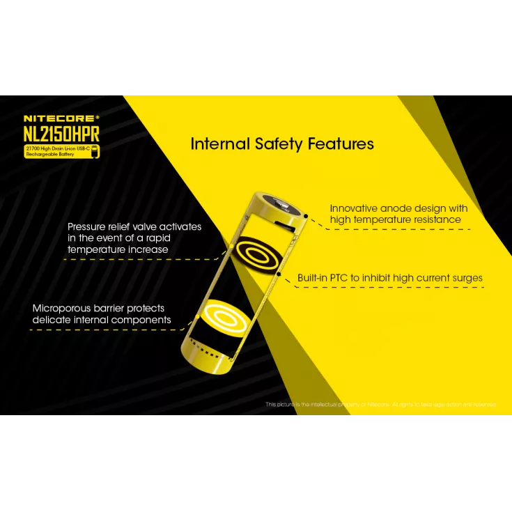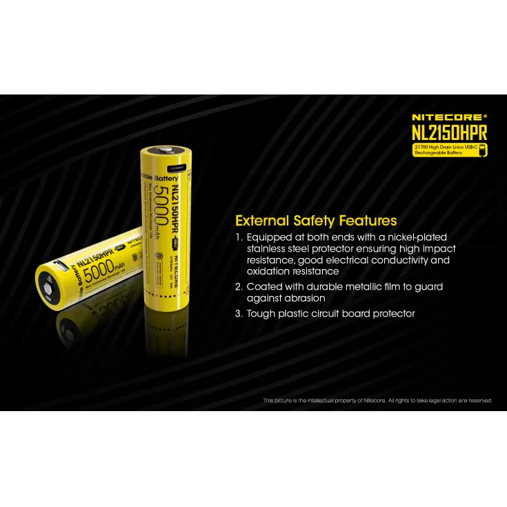 Safety is paramount to Nitecore and as with all their batteries, the NL2150HPR cell has a range of internal features to keep you and your devices as safe as possible. The 21700 battery has an innovative anode design with high temperature resistance, built-in PTC to inhibit high current surges, pressure relief valve which activates in the event of a rapid temperature increase and a microporous barries that protects the delicate internal components. Externally, the cell is equipped with nickel-plated stainless steel protectors at both ends and is coated with a durable metallic film to guard against abrasion.